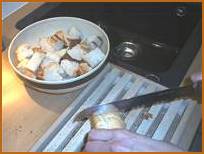 1.パンを小さく切る。 パンがパリパリしているのを好む人も多いので、数時間前に切っておく。