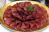 Bündnerfleisch(乾し牛肉) グラウビュンデン州の名産Bündnerfleischビュントナーフライシュは牛肉を塩蔵乾燥したもので、世界にも余り類が無いものです。質の落ちるものはBündnerfleischの名前を使うことができず、Hobelfleischホーベルフライシュという名前で売られています。