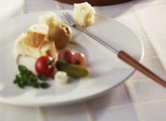 パン、チーズ、ワインはもともと食べ飽きないものなので、この元祖コンビのチーズフォンデューは食べる毎に新鮮で食べる毎に美味しいのです。でも、変化または新しいもの好きの人は他のものと組み合わせてもかまいません。 Bündnerfleisch (乾し牛肉)でワインを一杯飲んでフォンデューが出来あがるのを待つのも良いものです。 フォンデューの箸(フォーク)休めにも、極薄切りの乾し牛肉や 酢漬け小玉ねぎ 等は口に元気をつけて、フォンデューもますます進むというものです。 デラックス版フォンデュー Fondue riche にはパンの合間に食べるもの、パンのようにフォークに刺してチーズをからませて食べるものなどいろいろな美味しいものが付き物です。